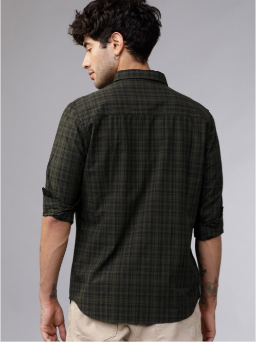 Olive Green & Black Slim Fit Checked Casual Shirt