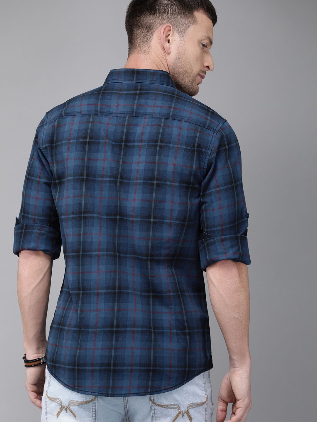 Blue and Black checked casual shirt, has a spread collar, long sleeves, button placket, curved hem, and 1 patch pocket